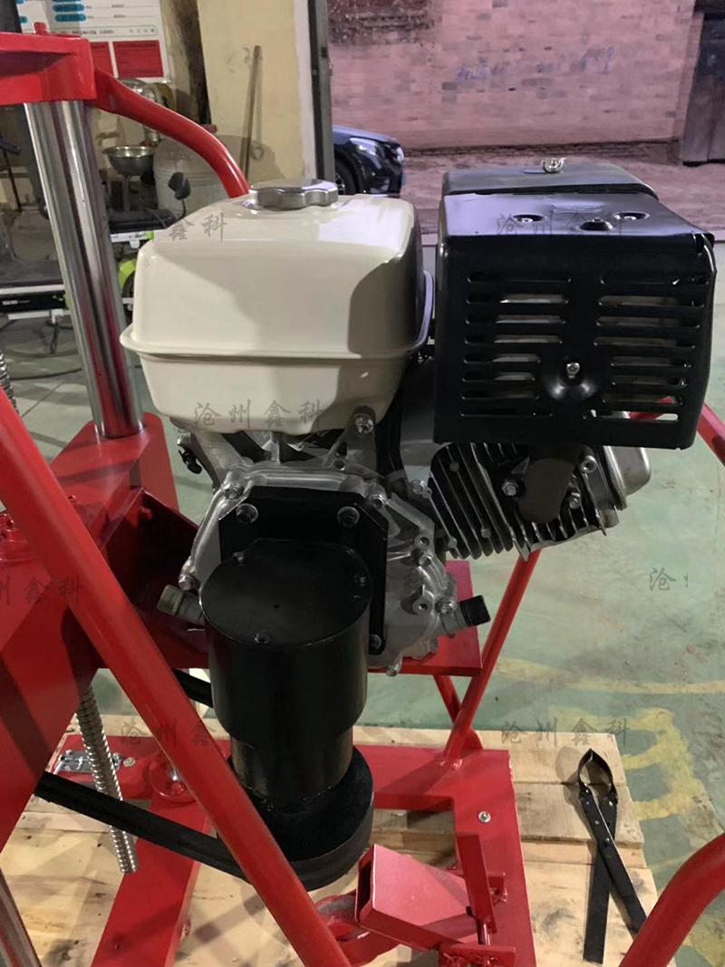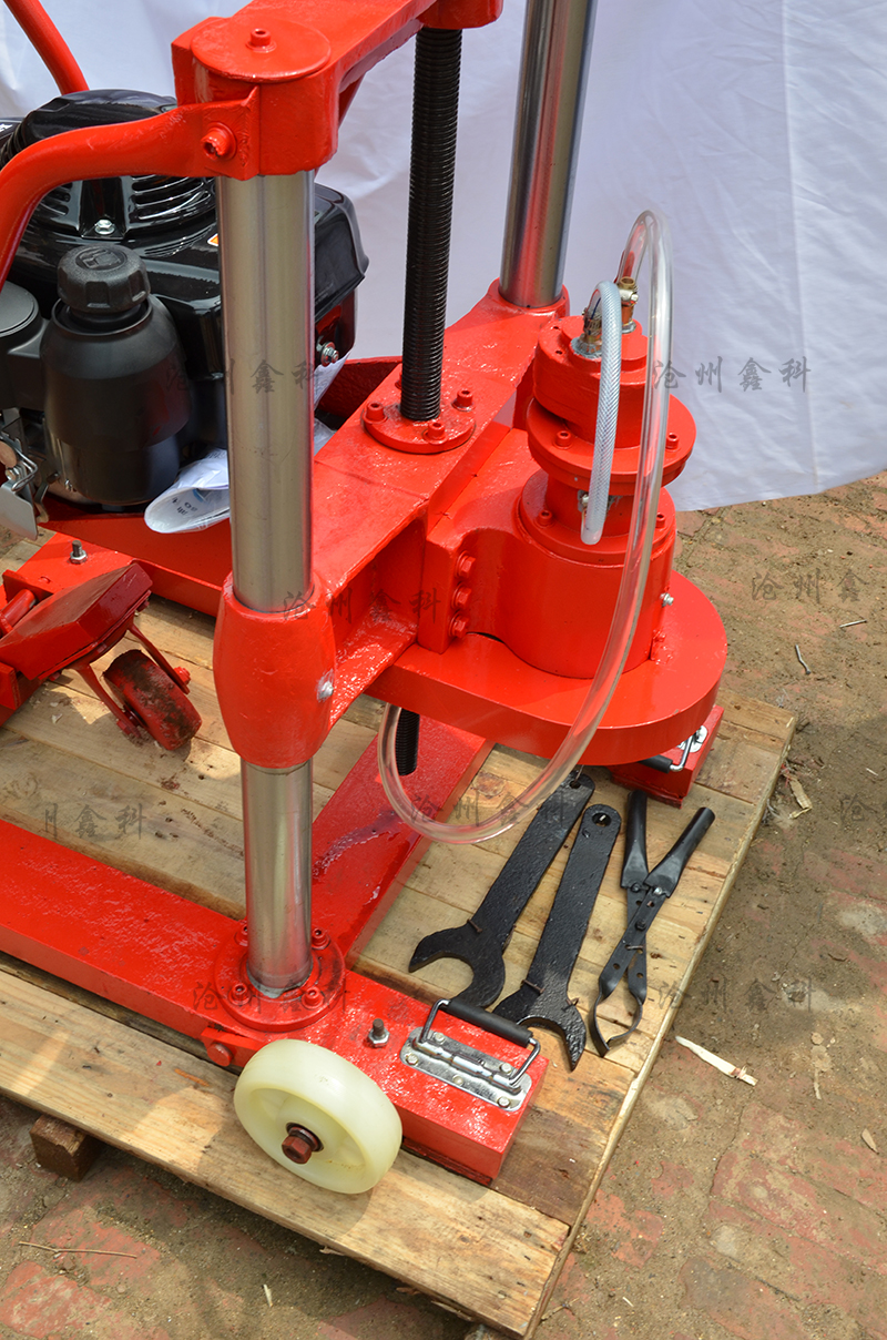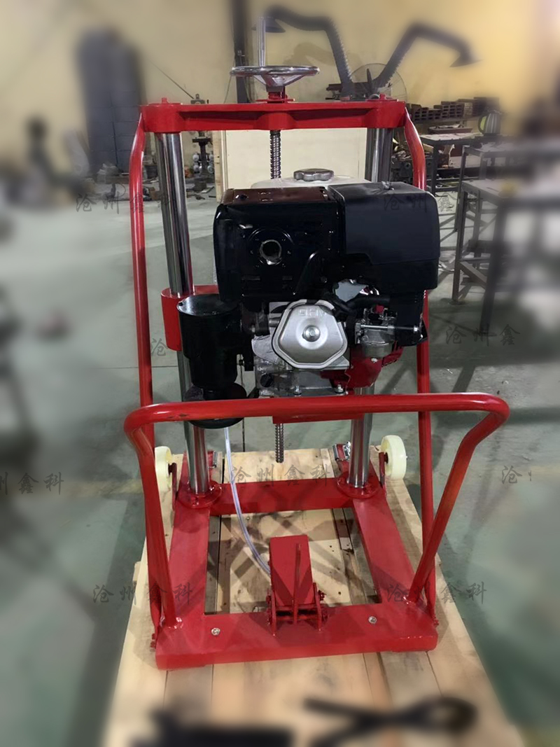 5、開孔:以上作業(yè)做好后,即可開孔作業(yè),裝上鉆頭,起動汽油機(詳情見汽油機用戶手冊)把進水管放入水桶內,水桶要提到高出水泵位置,然后手捏氣襄把水吸入水泵,水泵上水后把水桶放在地面即可。油門調至z大,開始輕搖給進手柄,使鉆頭緩慢接觸地面。開孔要訣:先給水后鉆進,給進速度要慢,鉆壓要小。嚴禁無水作業(yè),以免燒壞鉆頭和水封。