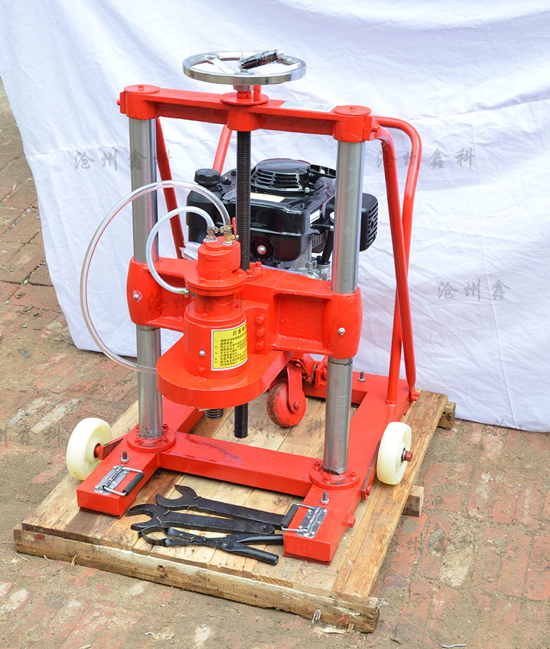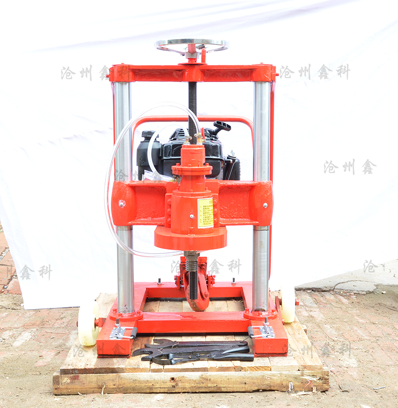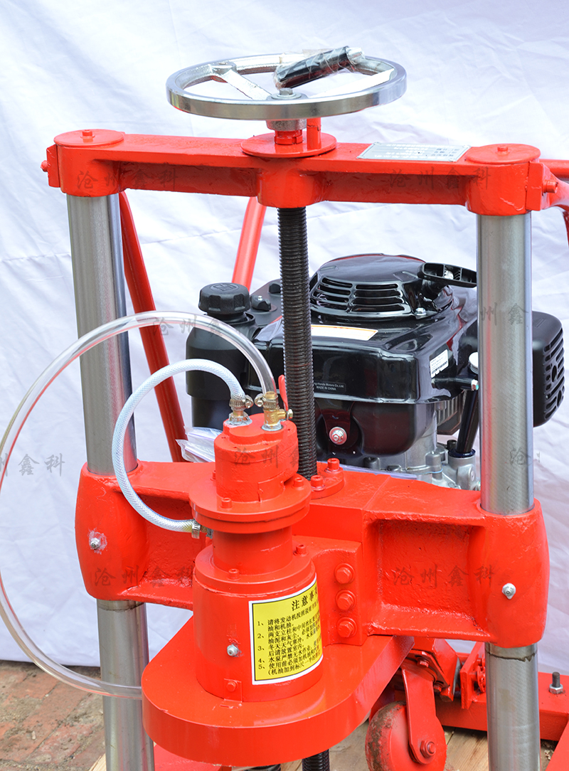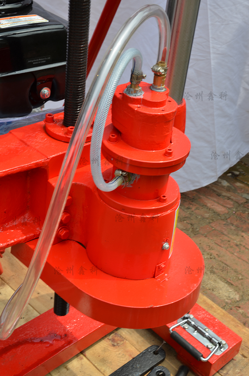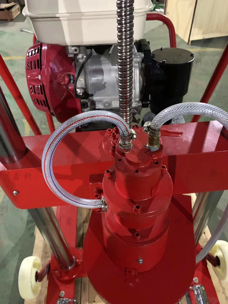 5、開(kāi)孔:以上作業(yè)做好后,即可開(kāi)孔作業(yè),裝上鉆頭,起動(dòng)汽油機(jī)(詳情見(jiàn)汽油機(jī)用戶手冊(cè))把進(jìn)水管放入水桶內(nèi),水桶要提到高出水泵位置,然后手捏氣襄把水吸入水泵,水泵上水后把水桶放在地面即可。油門(mén)調(diào)至最大,開(kāi)始輕搖給進(jìn)手柄,使鉆頭緩慢接觸地面。開(kāi)孔要訣:先給水后鉆進(jìn),給進(jìn)速度要慢,鉆壓要小。嚴(yán)禁無(wú)水作業(yè),以免燒壞鉆頭和水封。